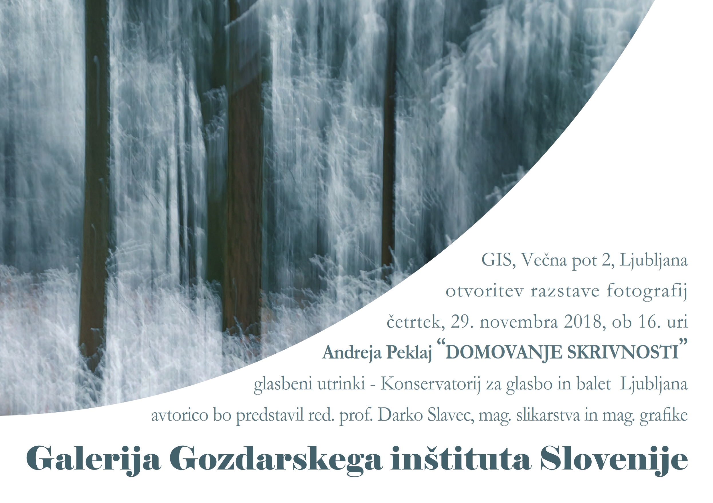 V četrtek, 29. novembra 2018, ob 16. uri vas vabimo na otvoritev razstave fotografij avtorice Andreje Peklaj “DOMOVANJE SKRIVNOSTI”. Razstava bo na ogled v galeriji GIS, Večna pot 2, Ljubljane.