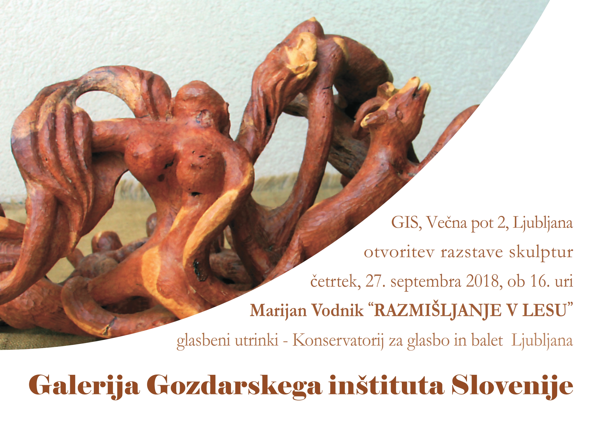 V četrtek, 27. septembra 2018, ob 16. uri vas vabimo na otvoritev razstave skulptur avtorja Marijana Vodnika “RAZMIŠLJANJE V LESU”. Razstava bo na ogled v galeriji GIS, Večna pot 2, Ljubljane.